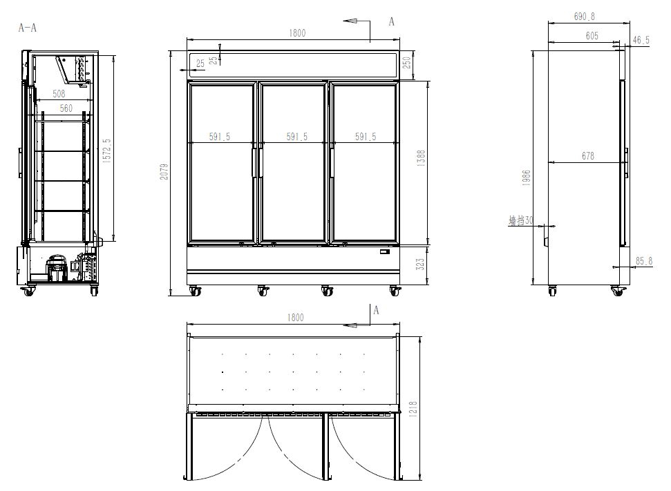 Produktinformationen "Getränke-Kühlschrank, +1 bis +10°C, 1065 Liter, 3 Türen, rollbar, Umluftkühlung, schwarz"