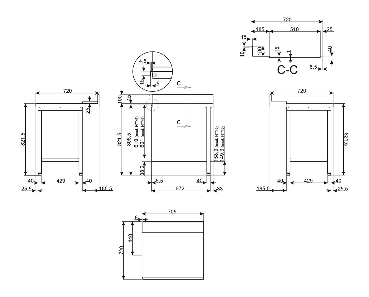 Ablauftisch mit Grundboden, Aufkantung hinten 100mm, Anbauseite rechts